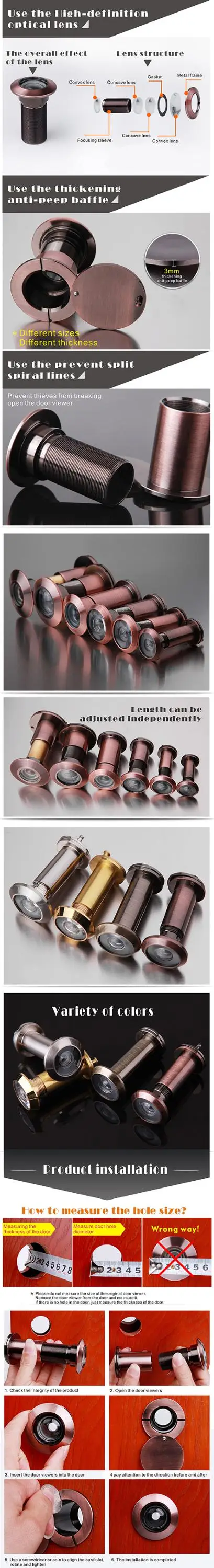 Ojo de puerta de latón Visor de puerta de lente de vidrio de seguridad de 200 grados de ancho para puerta delgada